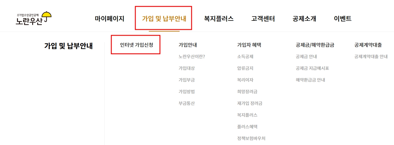 위의 이미지처럼 노란우산공제 홈페이지에서 상단에 보이는 "가입 및 납부안내 - 인터넷 가입신청"을 통해 인터넷 가입 신청이 가능합니다. 노란우산공제 가입방법 어렵지 않습니다.