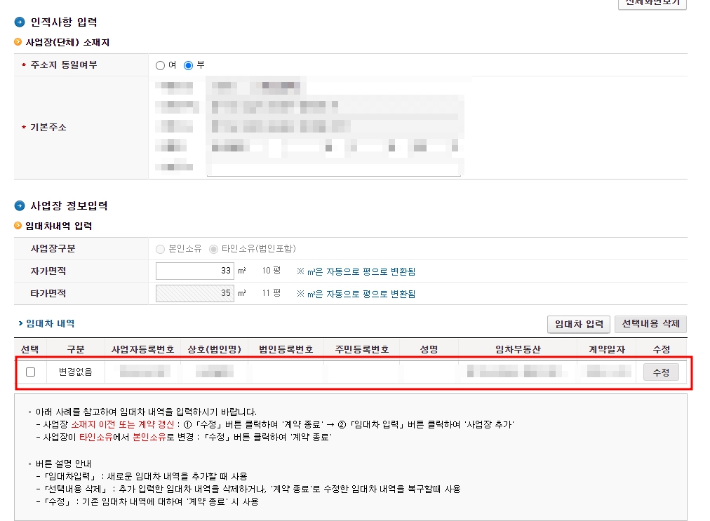 여기까지 하면 위의 우측 이미지처럼 기존에 등록되어 있던 사업장 주소와 정보들이 나옵니다. 거기서 수정 버튼을 누르고 이전한 사업장 주소를 기입하면 사업자등록증 주소변경 신청은 끝이 납니다.