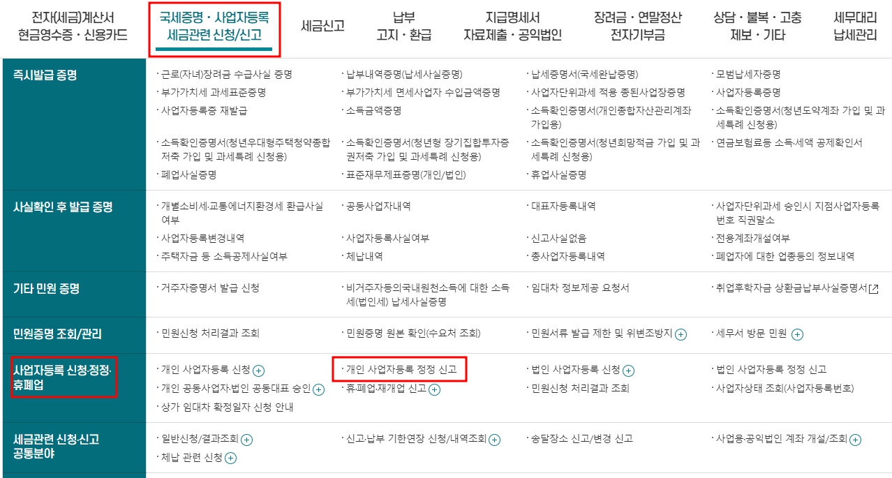 우선 홈택스에서 진행해야 합니다. 홈택스로 들어가면 아래 이미지처럼 "국세증명/사업자등록 세금 관련 신청/신고" 탭에서 "개인 사업자등록 정정 신고"가 보입니다. 이걸 선택해 주세요.