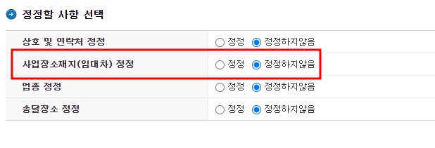 그럼 이제 선택한 사업자등록증에서 어떤 걸 정정할 지 선택해야 하는데요. 아래 이미지처럼 "사업장소재지 정정"에서 정정으로 체크하고 넘어가 줍니다.