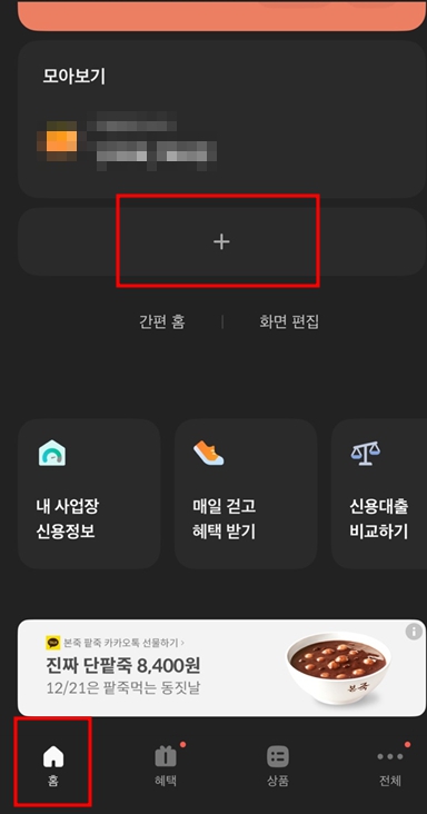 - 카카오뱅크를 처음 시작하면 홈 화면에 " + " 버튼이 보인다.