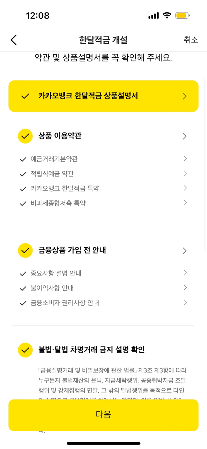 그럼 위처럼 춘식이가 나오고 "한달적금 신청하기" 버튼이 보입니다. 그 후 약관에 동의하고 매일 얼마씩 적금에 들건지 입금액을 입력하면 되는데요.