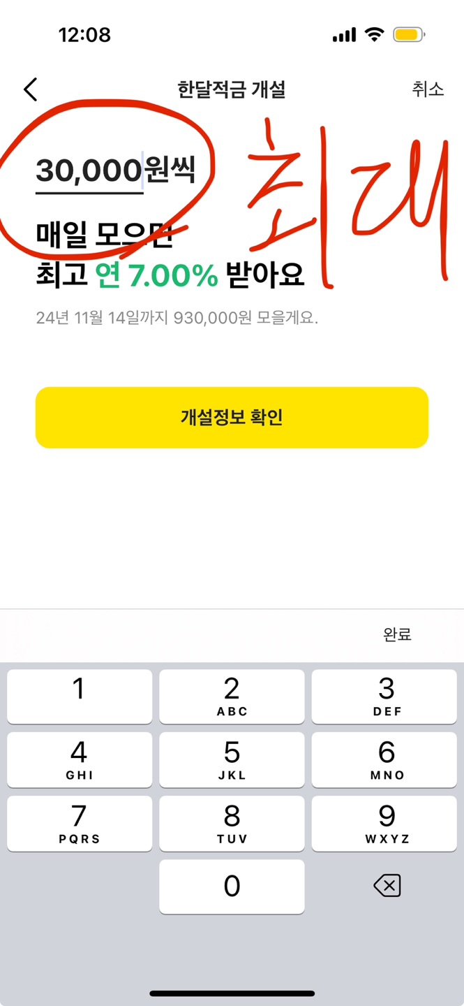 카카오뱅크 한달적금의 경우 금리가 7%이기 때문에 입금 상한액을 3만 원으로 정해뒀습니다. 그래서 하루 최대 3만 원까지만 입금 가능하고