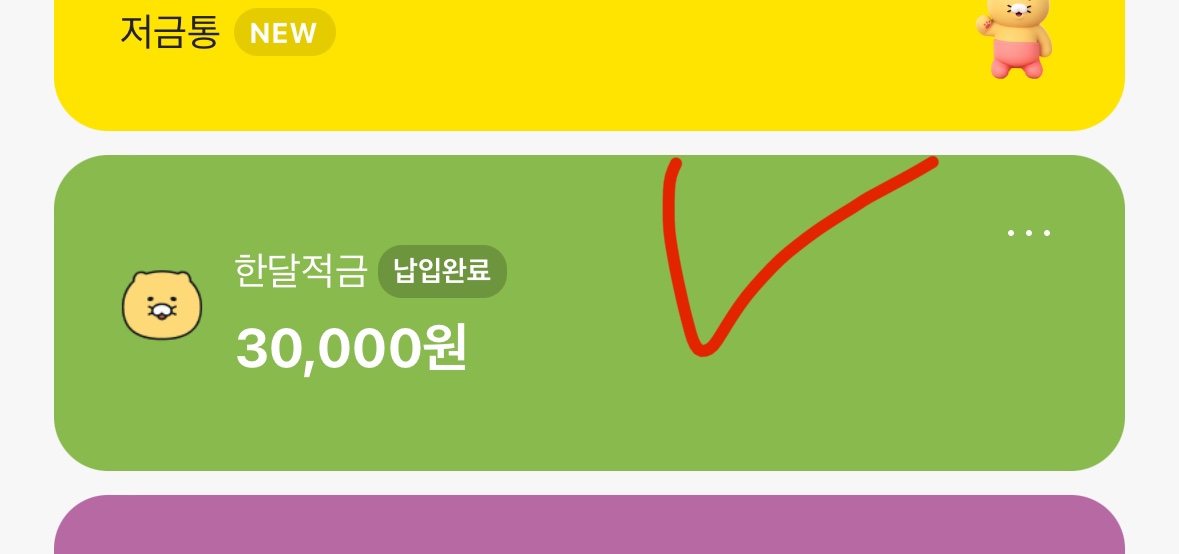 이렇게 카카오뱅크 한달적금에 가입하게 되면 카카오뱅크 메인 화면에 하나의 계좌가 추가로 생긴 걸 확인할 수 있습니다.