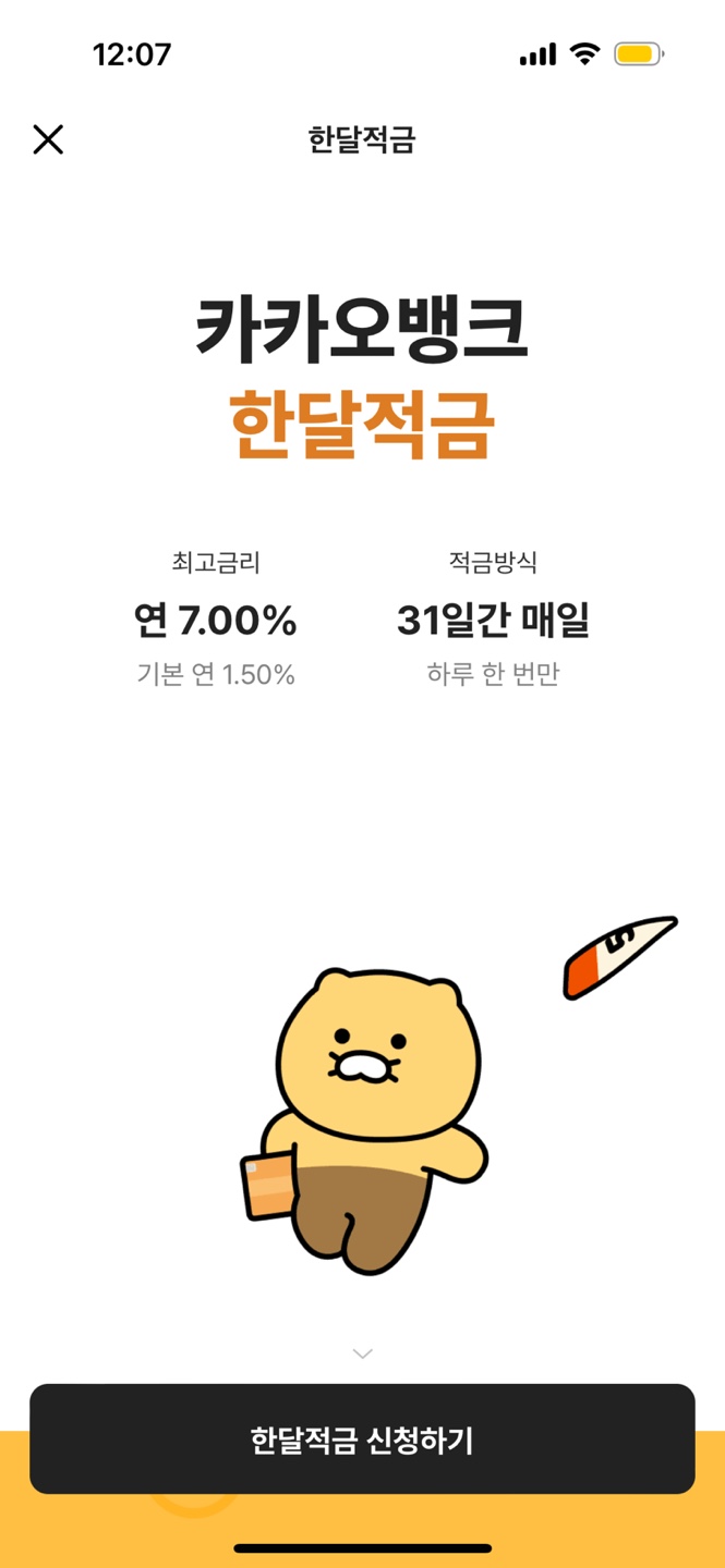 현재 카카오뱅크에서 가입 가능한 적금 상품은 4개이며 그중 카카오뱅크 한달적금 금리가 최대 연 7%로 가장 높습니다. 한달적금 금리는 언제 변동될지 모르니 지금 바로 신청하시기 바랍니다.