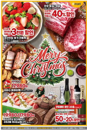 12월 크리스마스와 연말 맞이 이마트 할인행사를 진행한다고 합니다. 당장 오늘(20일)부터 26일까지 일주일간 한우를 포함한 와인, 과일 등 할인전을 연다고 공지했습니다.